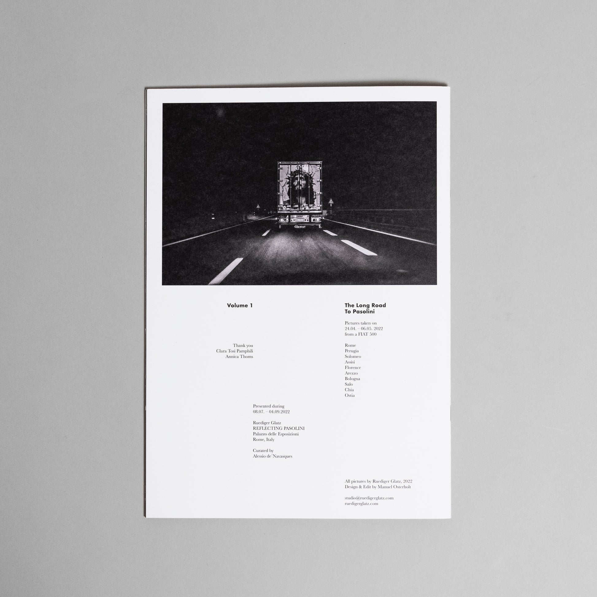 The Long Road to Pasolini is a photographic zine by Ruediger Glatz that traces a quiet, personal journey toward the figure of Pier Paolo Pasolini—not as portrait, but as presence. Moving between observation, travel, and inner reflection, the work unfolds as a visual essay shaped by distance, memory, and longing. Rather than illustrating Pasolini directly, the images circle around his ideas, locations, and contradictions, allowing absence, atmosphere, and fragments of reality to speak. The zine reads like a road movie in stills: restrained, intimate, and unresolved. The Long Road to Pasolini is less about arriving than about staying with the questions Pasolini left behind—political, poetic, and deeply human